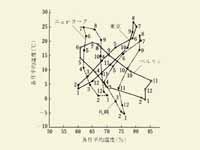 特定の地域の、各月の平均気温と平均湿度の関係を1年間にわたって表示するグラフです