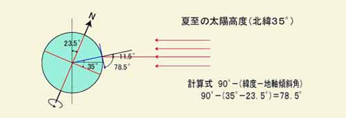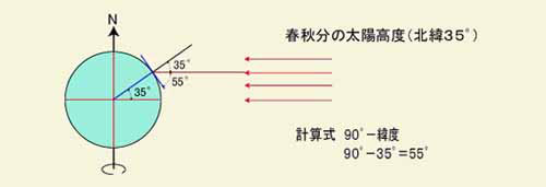 | ◆太陽からの受光量、受熱量はその地点の緯度、季節、時刻によって変わってきます。それは、太陽の高度を計算してみることによっても、わかります。 |