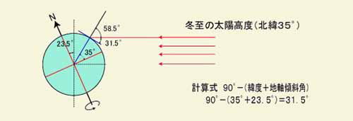 | ◆各季節の正午に南窓から入射する日射の深さは、太陽の高度から計算できます。北緯35゜地点の各季節の日射の深さです。 |