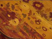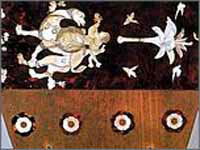 彫りあがったら上から漆を摺り込み、文様以外の漆を拭き取り、金銀の箔を文様にそって真綿で押し込み、文様以外の箔は取り払う |