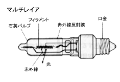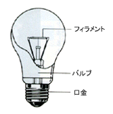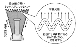 | ●タングステンのフィラメントに電流が流れると、フィラメント自体の電気抵抗によって2千数百度に熱せられ、白熱化し、やや赤みを帯びた白色光を発します。いわゆる鉄を熱し続けると光を発するのと同じ原理です。 |