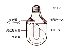 | ●コンパクトサイズの専用ランプと、点灯回路を一体化し、電球と同じ口金(E26)をつけた蛍光灯です。蛍光灯と同様に、水銀蒸気中の放電によって紫外線を発生させ、この紫外線による蛍光物質の発光を利用しています。 |