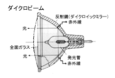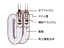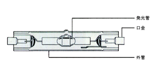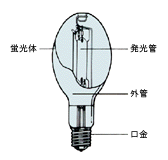 | ●基本原理は蛍光灯と同じで、発光管内の放電によって発光します。しかし、蛍光灯の場合と比べ、点灯中の封入沃化物などの封入圧力と温度が高いため、可視光線を多く発生します。 |