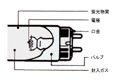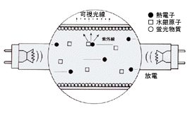 | ●点灯の際、電極に電流を流すと加熱され、フィラメントから熱電子が管内に放出され、放電が始まります。放電により流れる電子は、管内の水銀原子と衝突して紫外線(253.7nm)を発生します。この紫外線が蛍光物質に照射され、可視光線に変わります。蛍光物質の種類によって、いろいろな光色を放ちます。 |