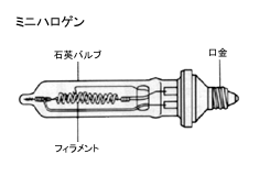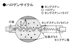 | ●一般の電球と同じように、コイル状のフィラメントを加熱して発光します。一般の電球では、高温のフィラメントからタングステンが徐々に蒸発し、バルブに付着して黒化現象を起こし光束を低下させますが、ハロゲン電球では、封入したハロゲン元素の働きにより、蒸発したタングステンとハロゲン原子が結合し、タングステンがバルブに付着するのを防止します。これにより、効率を高めると同時に点灯時間に伴う光束低下を抑え、長寿命化を実現します。 |