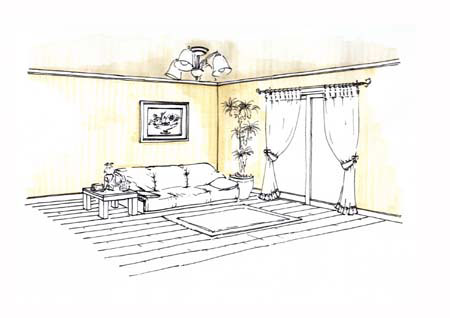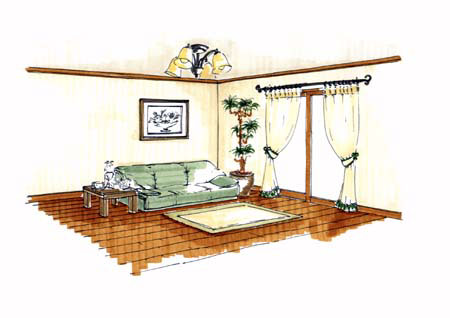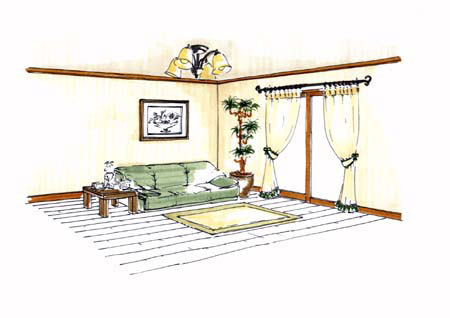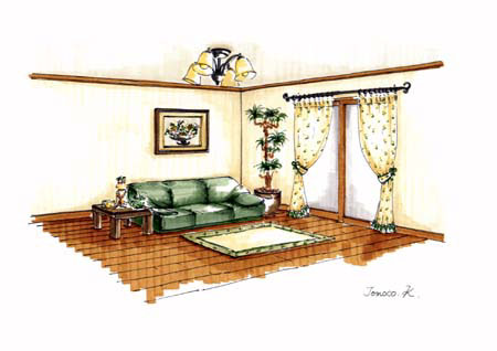 ■最後に、家具・ファブリックの濃淡やカーテンの柄など、細部を着彩して仕上げます