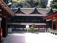 ■山口県下関市の住吉神社です。神功(じんぐう)皇后にゆかりのある極めて古いと伝えられる神社です。大内弘世(おおうち ひろよ)が応安3年(1370)に創建した九間社流造(くけんしゃながれづくり)と呼ばれる本殿は国宝に、拝殿は毛利元就の寄進によるもので重要文化財に指定されています。