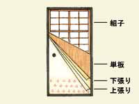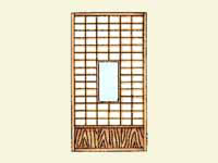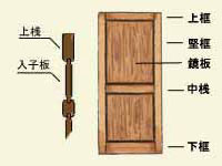 框を組んだ中に縦横の桟を入れ、これに薄い入れ子板を固定した開戸