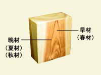 春から夏における生長期の初めに形成される部分を早材(春材)、夏から秋の後半に形成される部分を晩材(夏材・秋材)といい、これが年輪になります