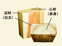 心材は、一般に赤や褐色などの濃色をしており、硬質で狂いが少なく、耐久性が大きい