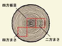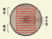 木の繊維方向に直角に切断した面を木口面、平行に切断した面で中心軸を含む面を柾目面、中心軸を含まない面を板目面と言います
